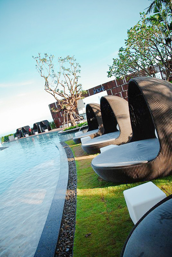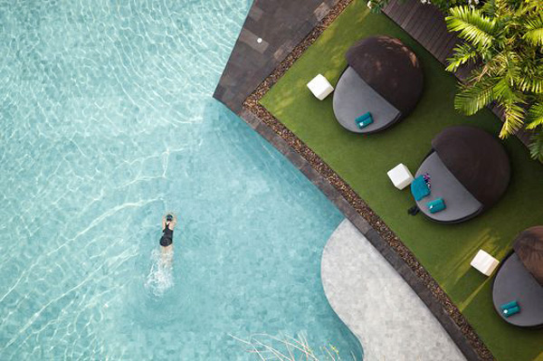 每個區(qū)域的鋪裝不同,每個區(qū)域內(nèi)部的鋪裝相同或相近,與植物搭配,形成高檔度假酒店的氛圍,并起到指示和分隔的功能。